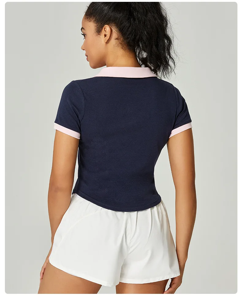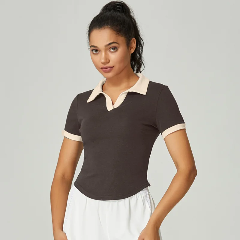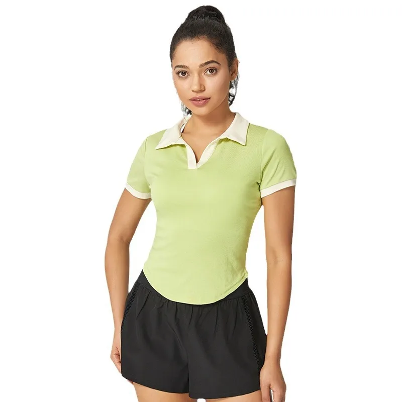 Tennis Short sleeved T-shirt Spring/Summer Contrast V-neck Flip Collar Sweat-absorbing Fitness Sports T-shirt Yoga Dress Women